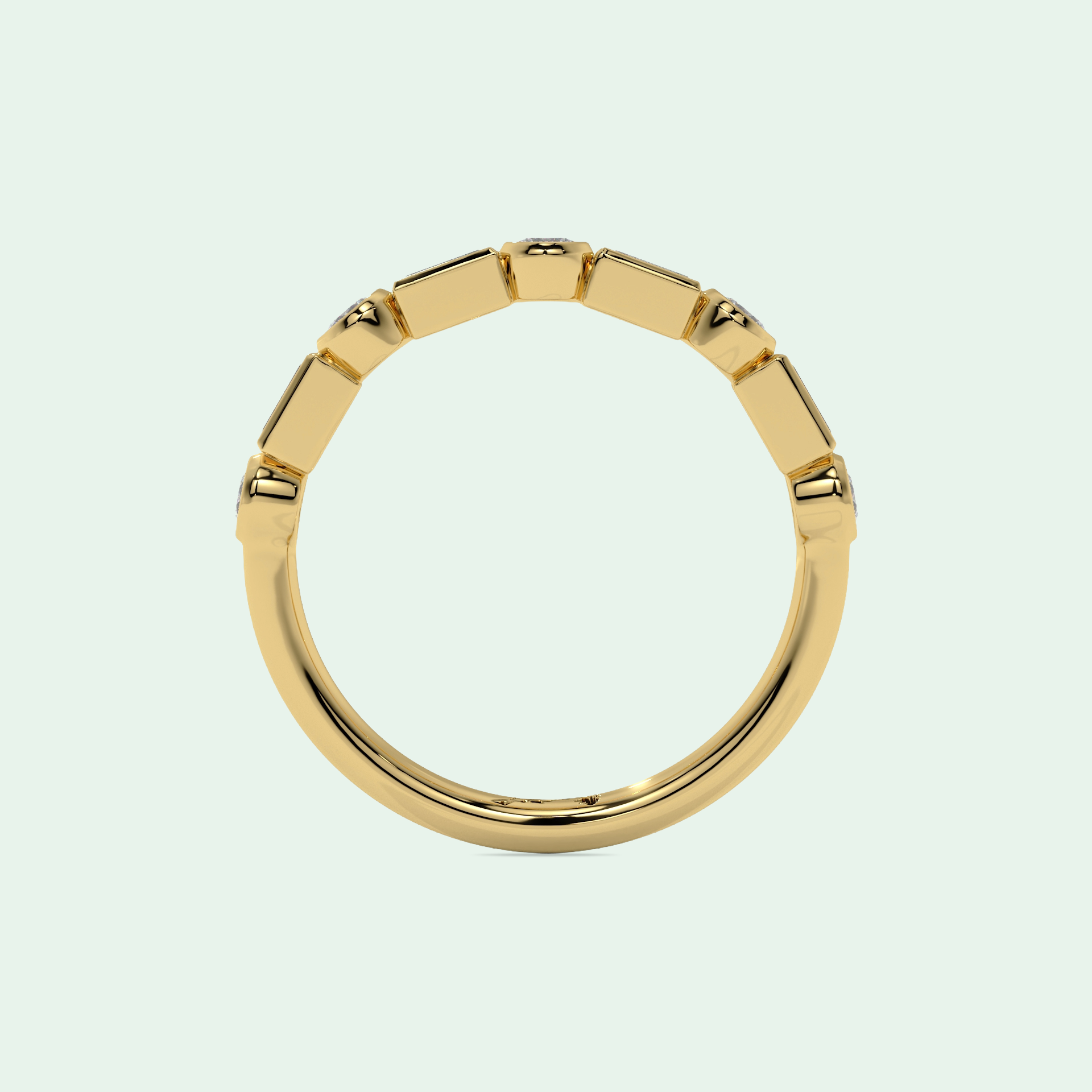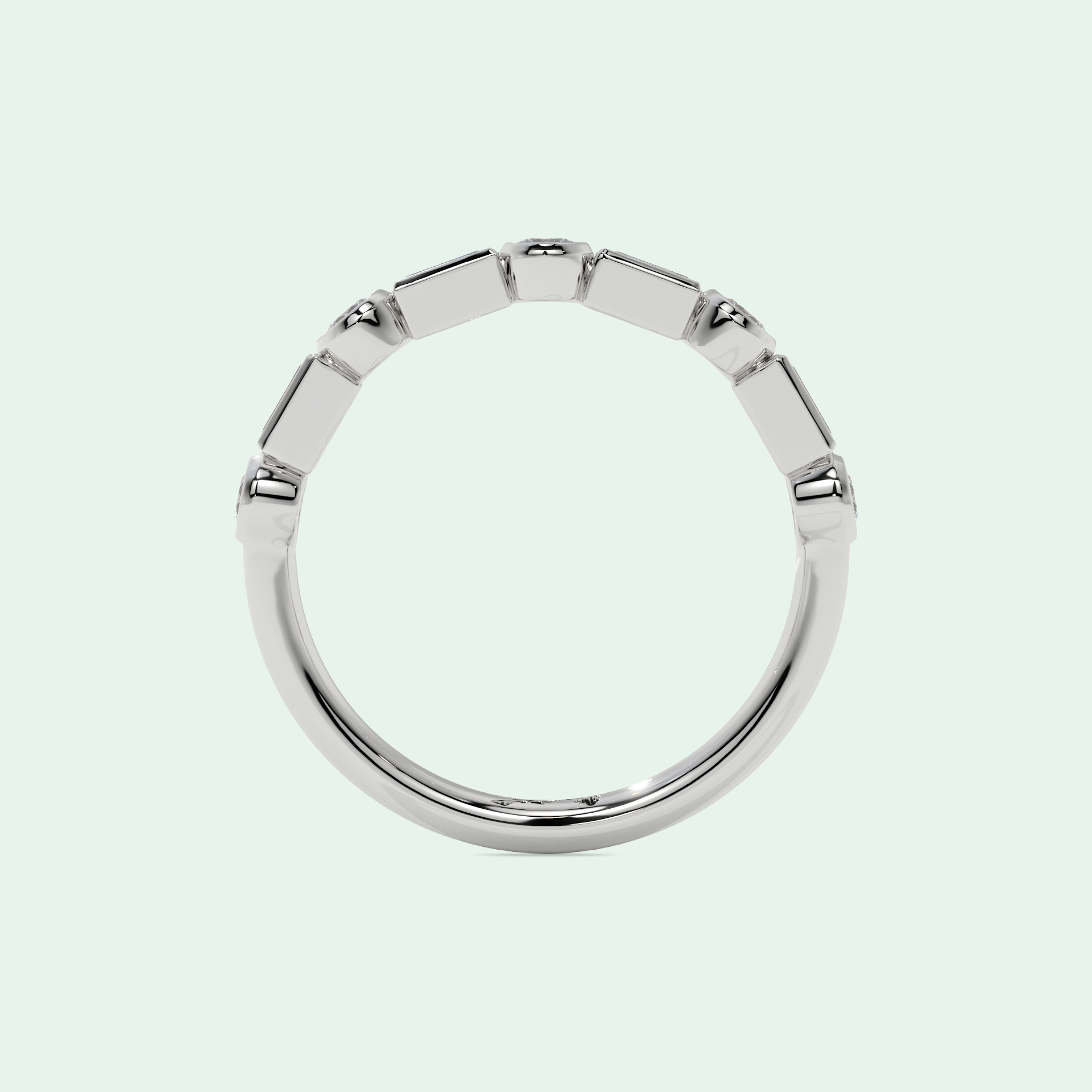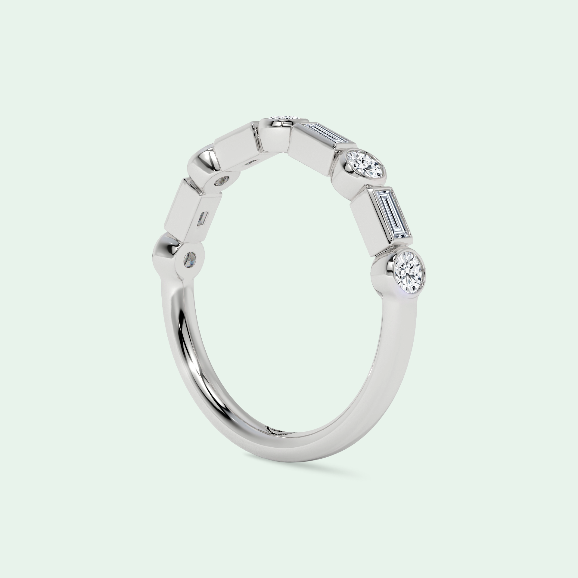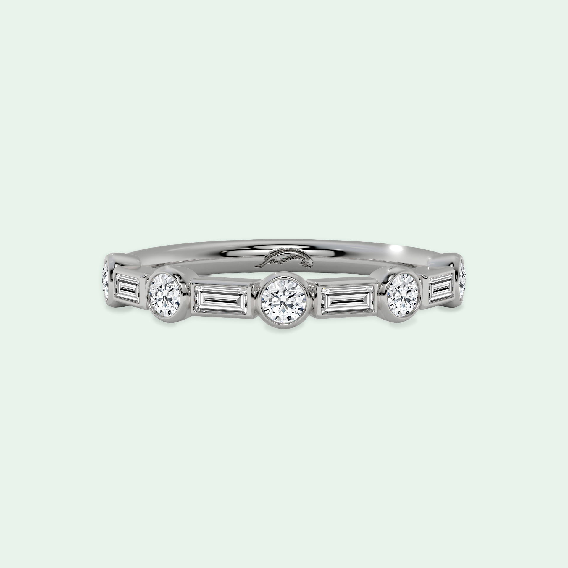 This Baleni Bezel Setting Wedding Ring is enough to sing the song of your love journey. At its heart of the ring lies a mesmerising round-baguette diamond radiating brilliance while the bezel setting is a testament to protection and everlasting love.