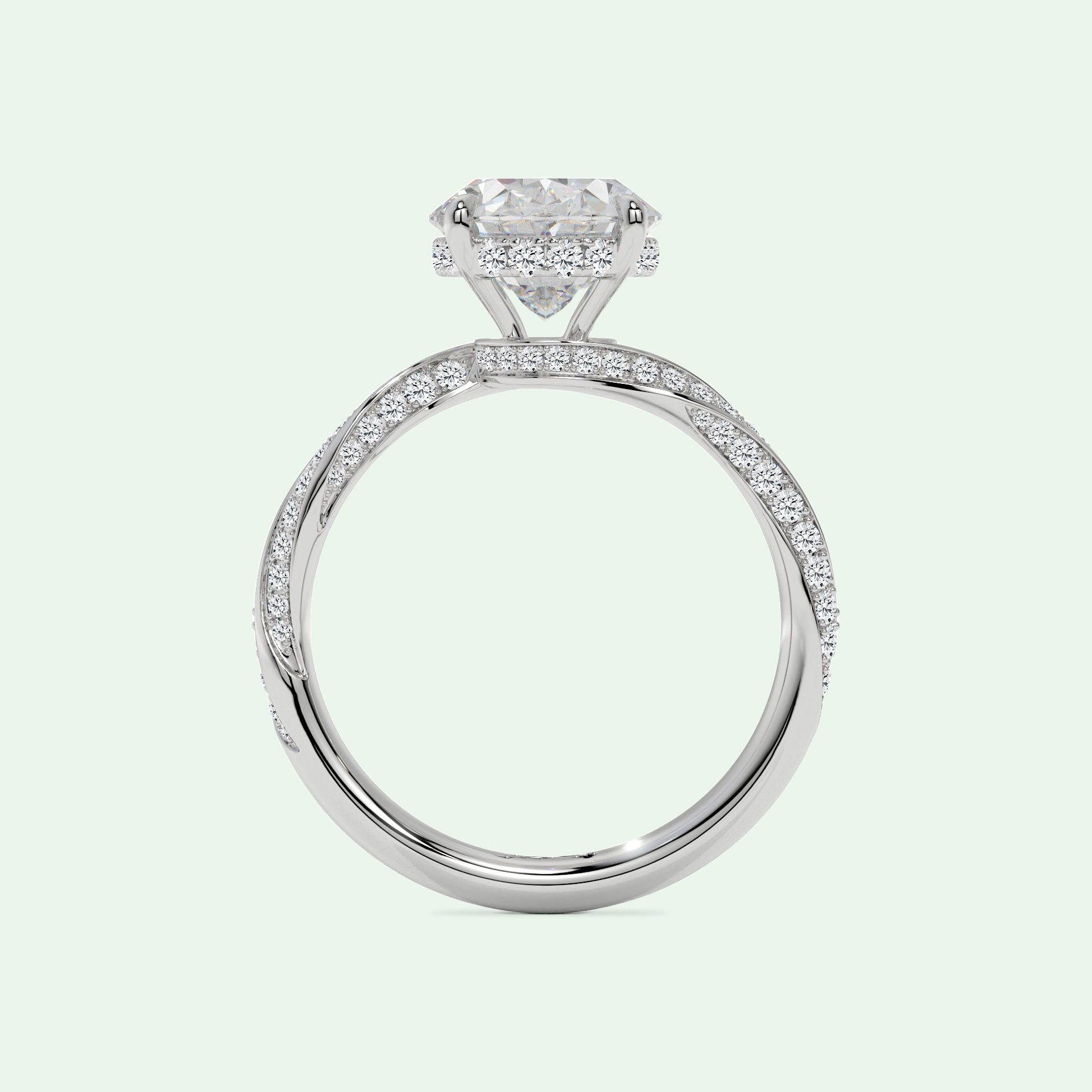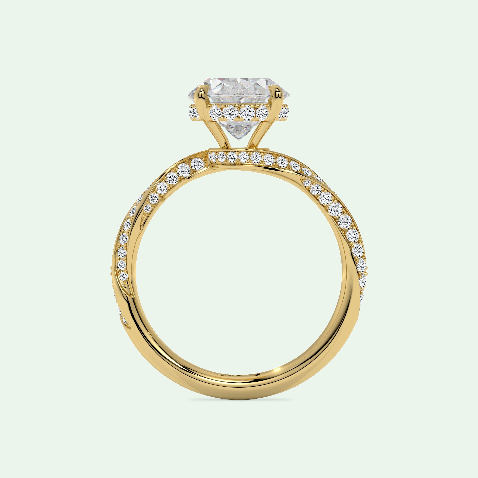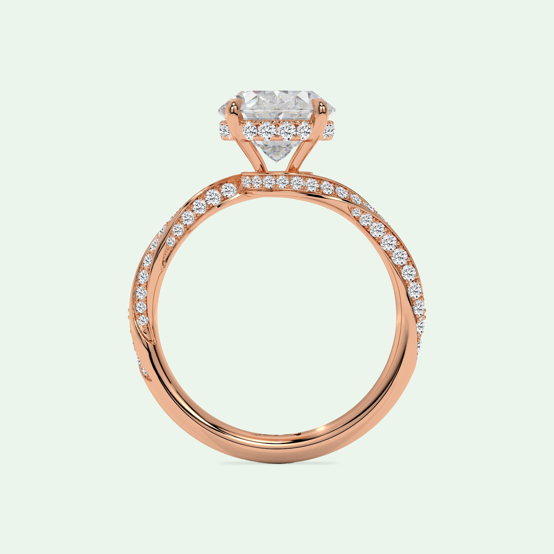 What amps her up more than a lovely ring on her finger? This Spiral Hidden Halo ring is synonymous to the radiating hidden glow that accentuates her mood. The dazzling round-cut accent stones set in spiraling pattern around the band enbellished with oval centre diamond is a sunbeam for your beautiful lady.