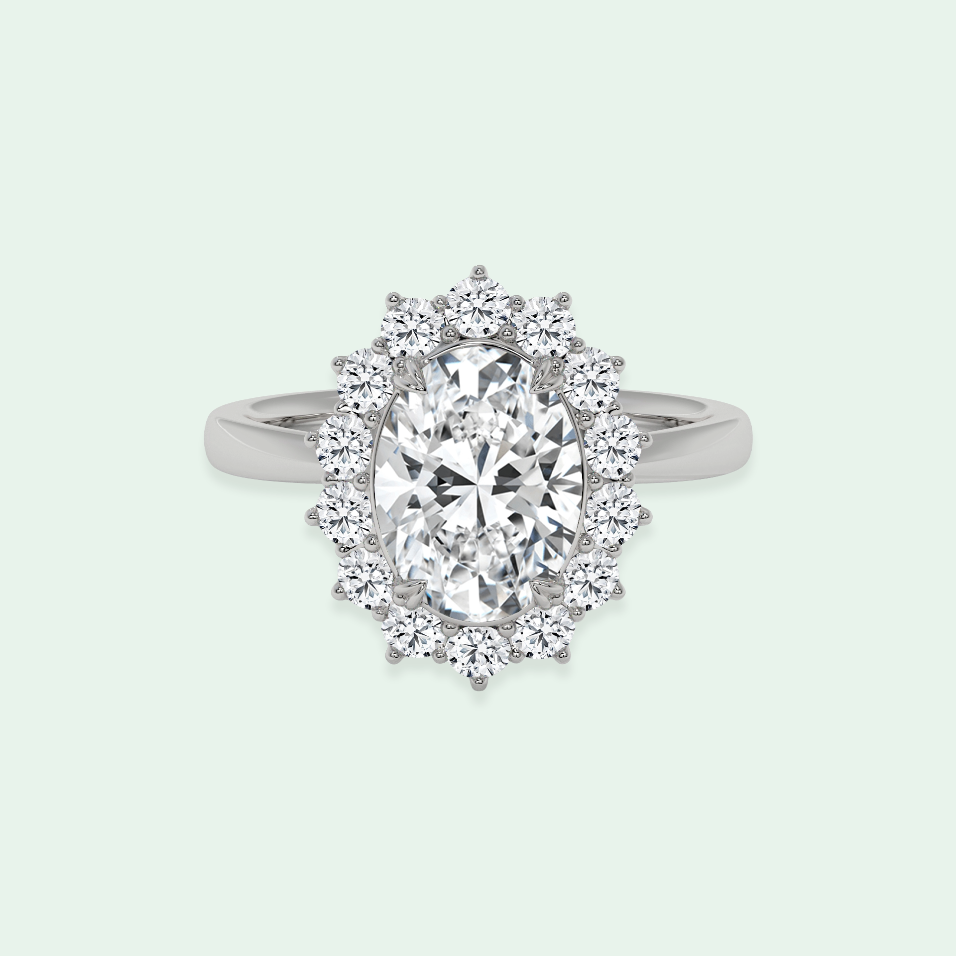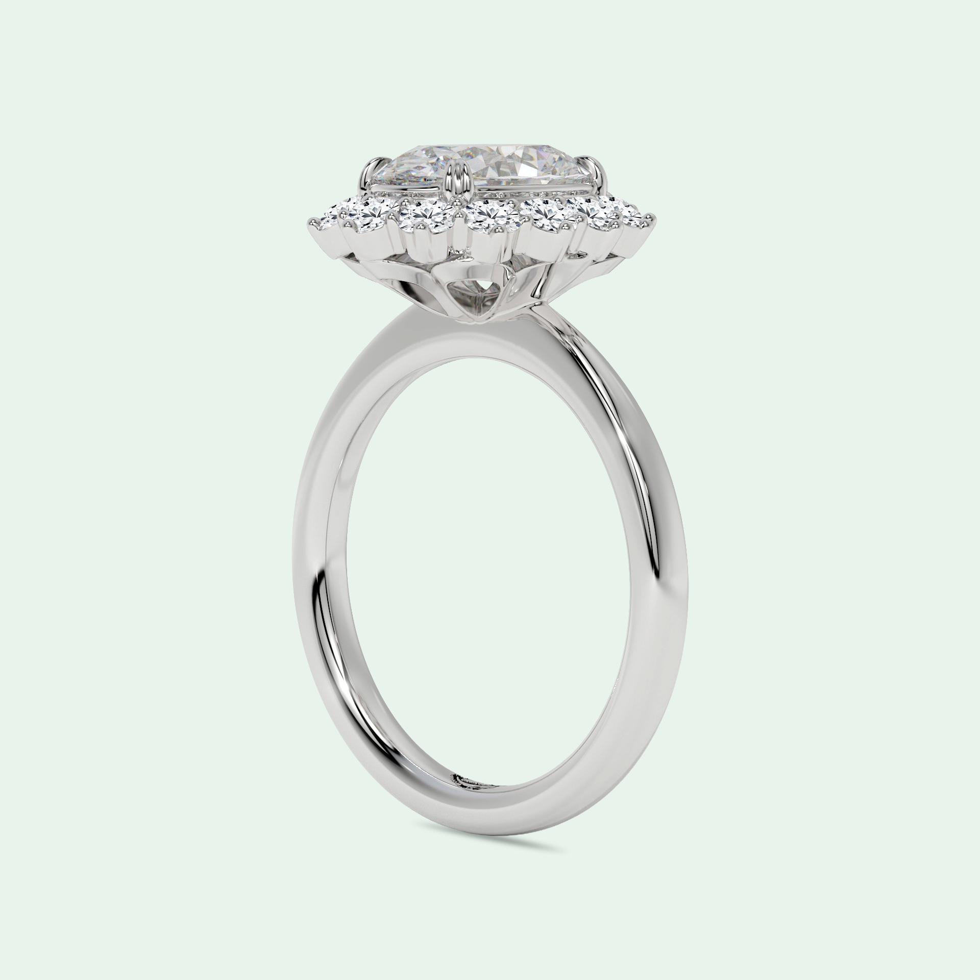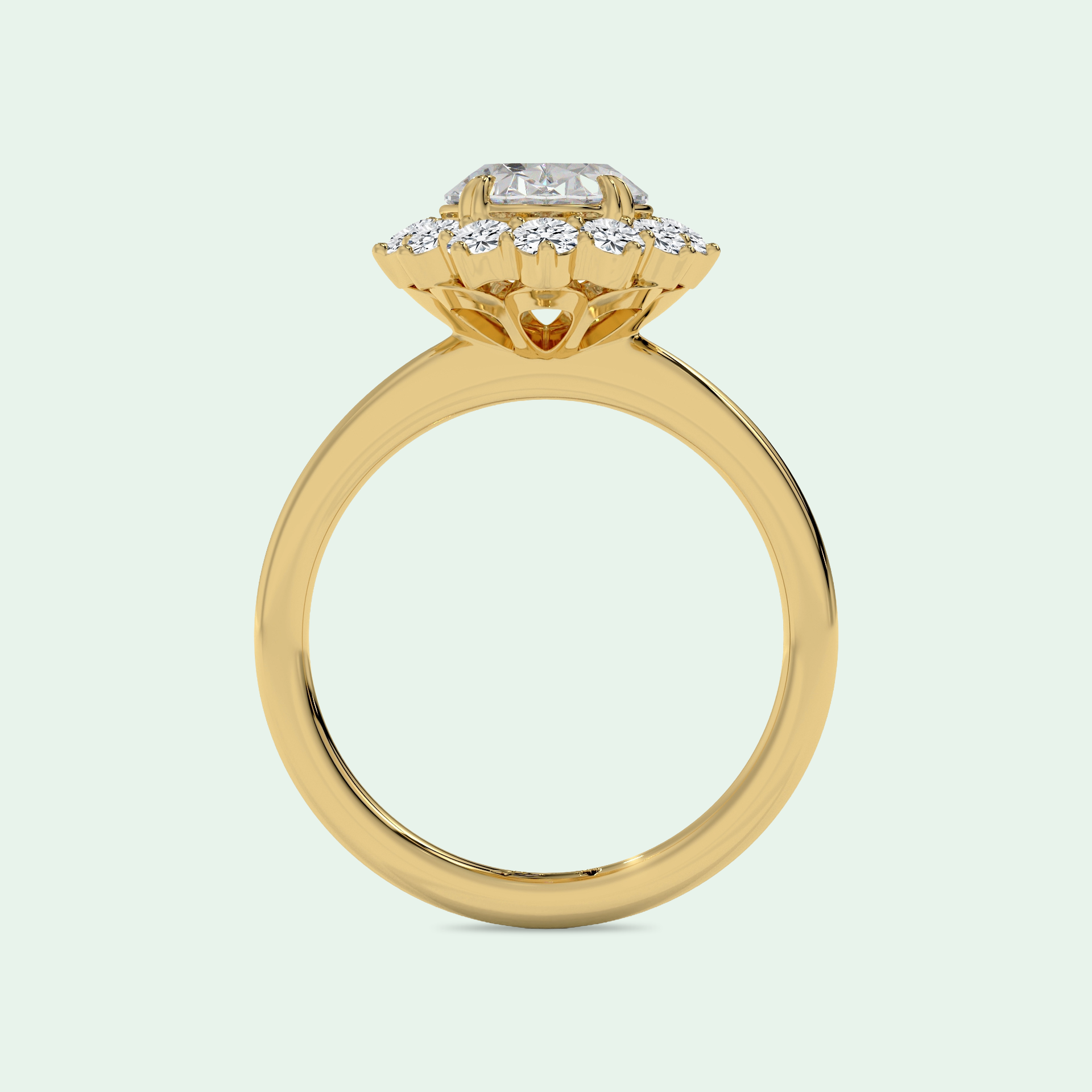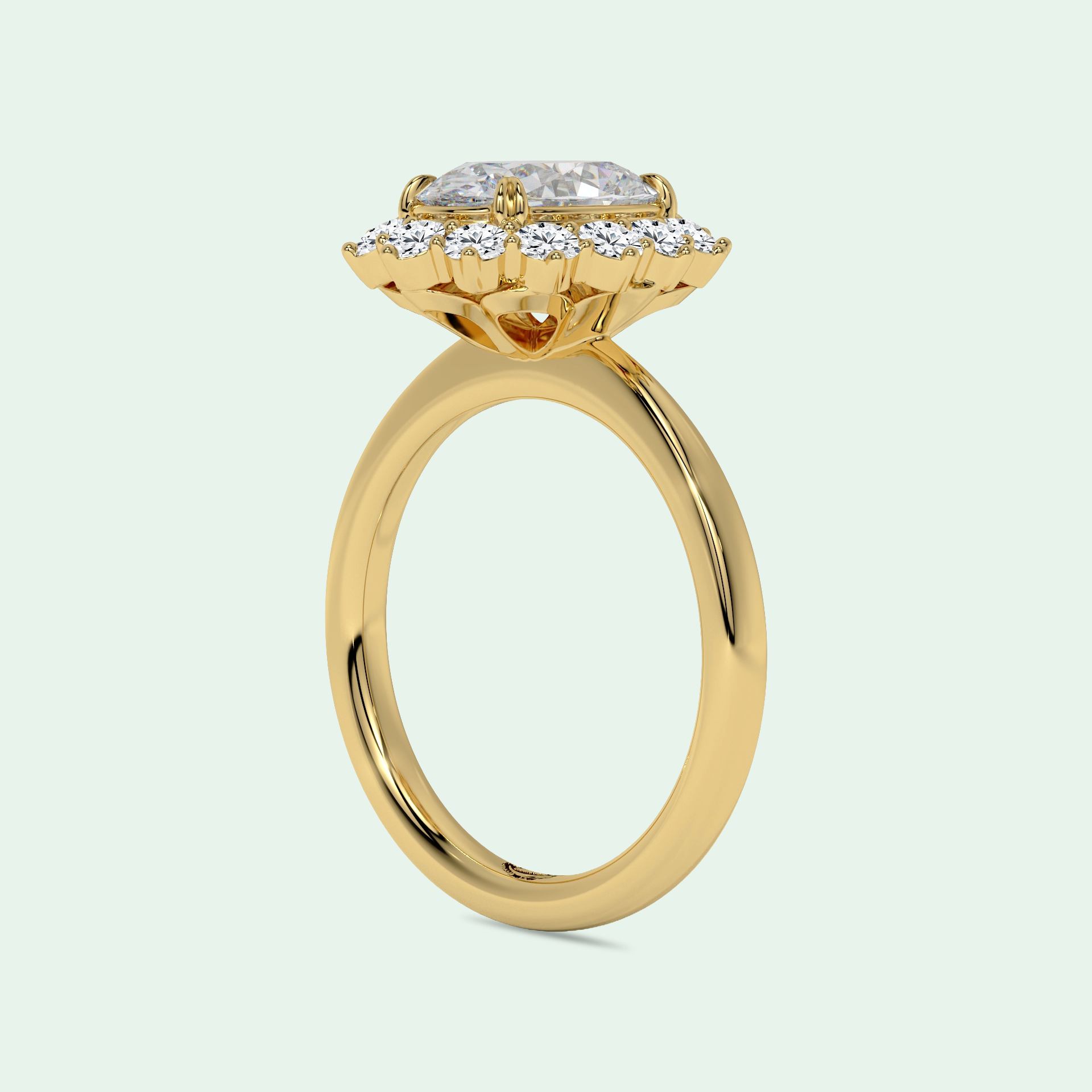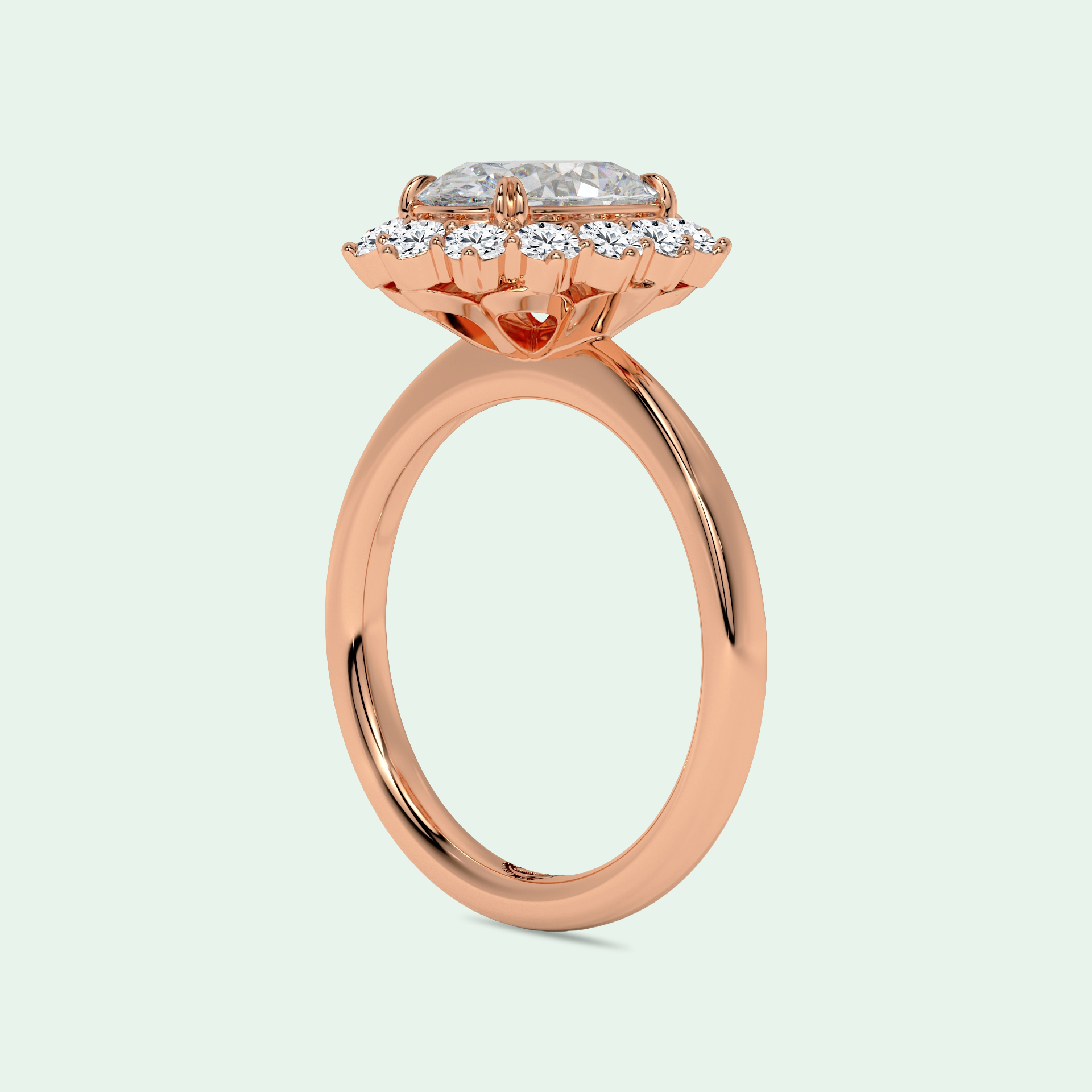 This Victorian Halo ring will let you lose her in your romantic reverie. Each detailing of the ring projects your everlasting love while its design of shimmering center stone and flowery petal-like diamonds sideways reflects timeless elegence. Gift it to let her drown in its mesmerising beauty.